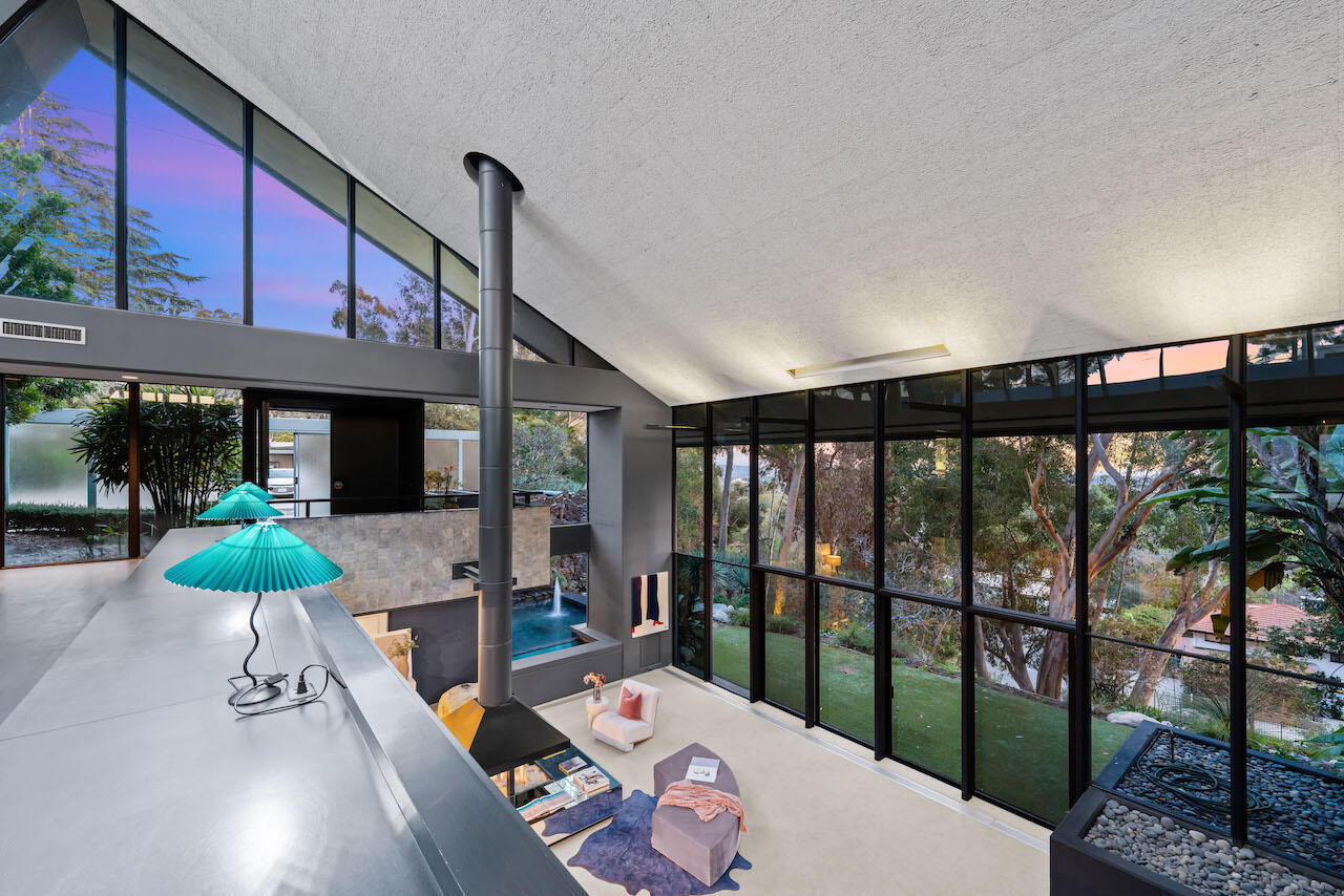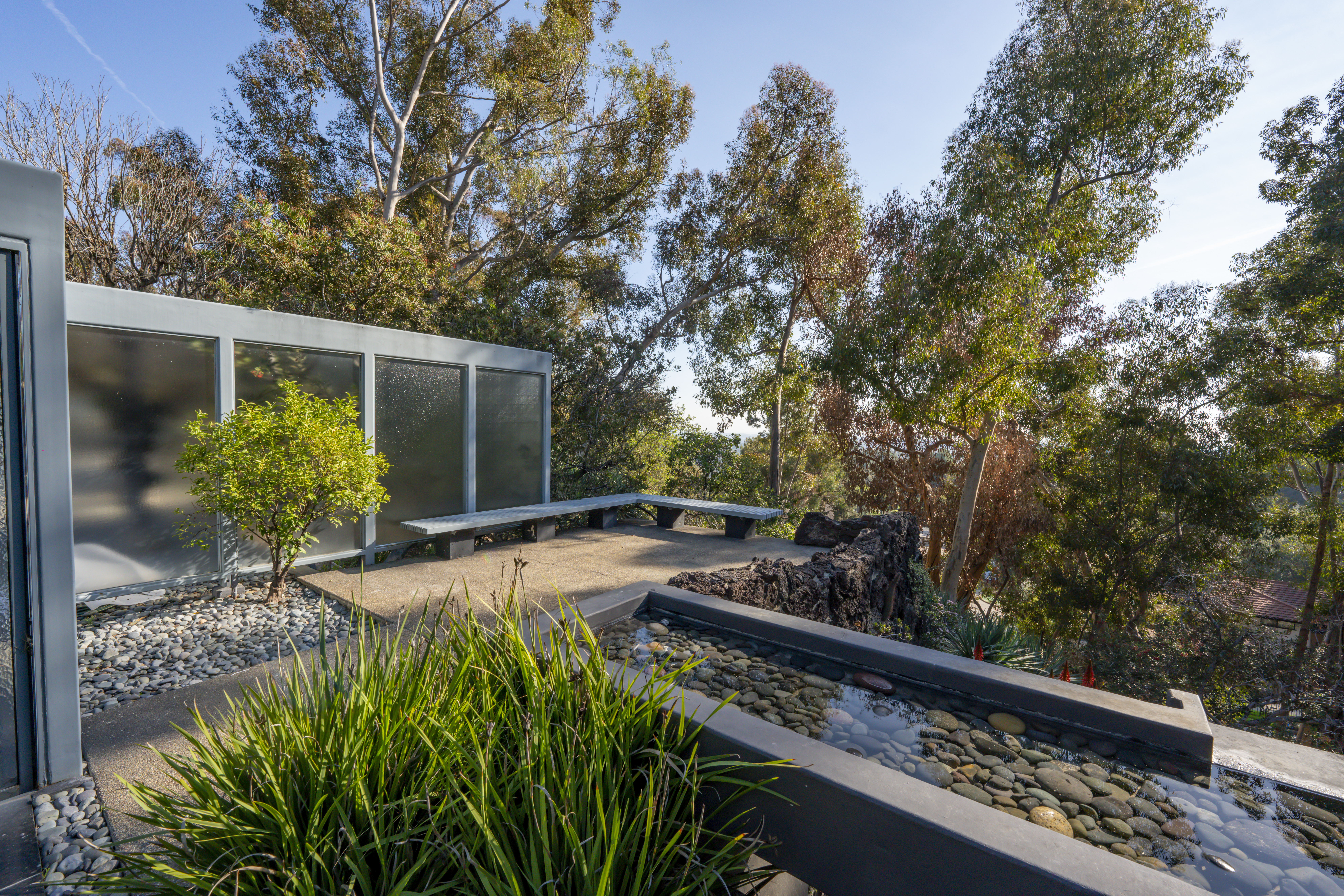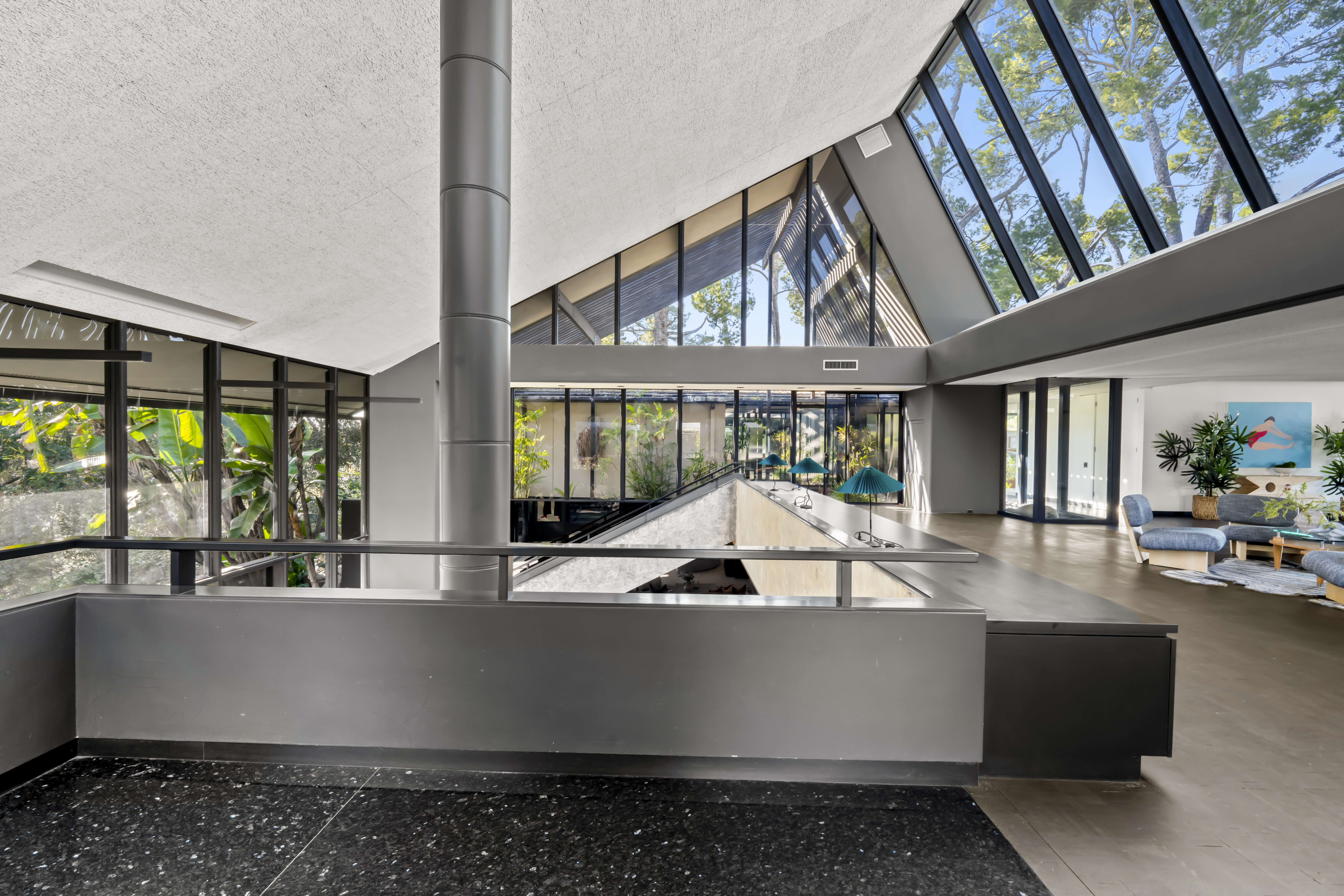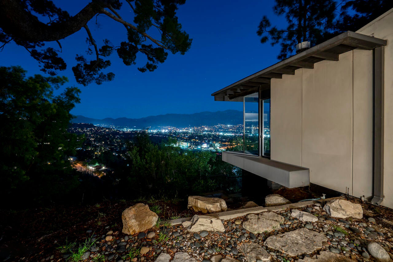 Live in an architectural masterpiece of the modernist style. Your residence was built in 1973 by Quincy Jones, a luminary and AIA award-winning architect. Jones' aesthetic runs throughout the home, from the intimate connection with nature to the high ceilings and walls of glass. You'll feel like you are in a treehouse as the home cantilevers over its elevated lot and into the surrounding vegetation. The open-plan design and striking setting create the perfect backdrop for all-season entertaining. Walls of glass bring in a ton of light and stunning views in every direction. The interior spaces flow seamlessly, offering an endless supply of picturesque vignettes marrying the built and natural environment. No matter your mood, 1100 Paso Alto Road is a place for revelry and rest. Enjoy a private view from your primary suite balcony, or pick a bench outside. The thoughtful design of the outdoor living area invites serenity to the soundtrack of trickling water.