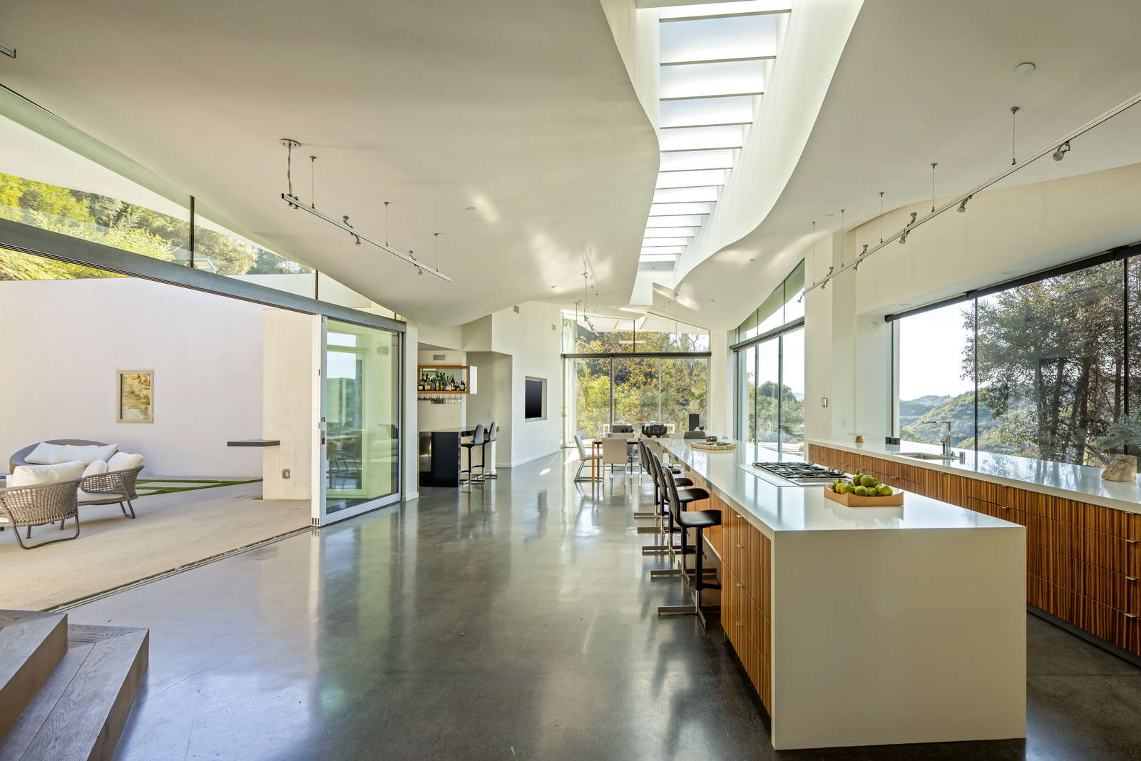 Beyond the private gated entry, an expansive open-concept living space unfolds, framed by floor-to-ceiling glass that captures breathtaking vistas. The spacious family room, complete with a built-in theater, flows into a sleek designer kitchen featuring top-of-the-line Gaggenau appliances, a walk-in pantry, coffee nook, and bar. A secluded alfresco dining area with a built-in grill extends from the kitchen, while the formal dining and living areas open onto an expansive deck—ideal for entertaining or quiet relaxation. A dramatic skylight spans the main living area, further enhancing the home’s architectural brilliance.