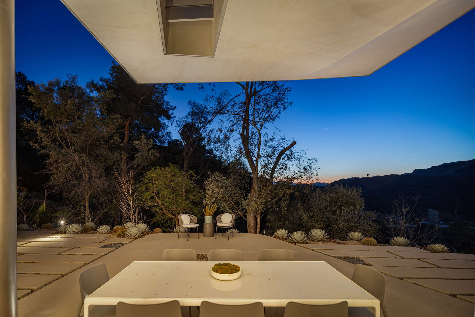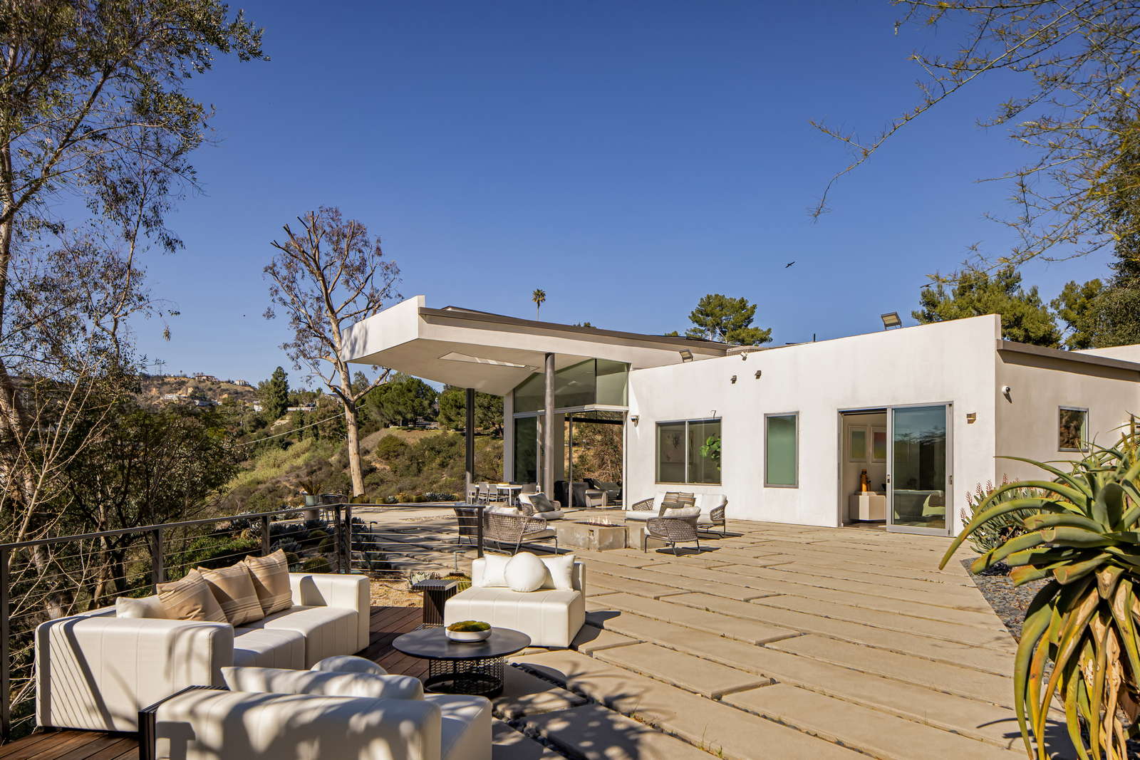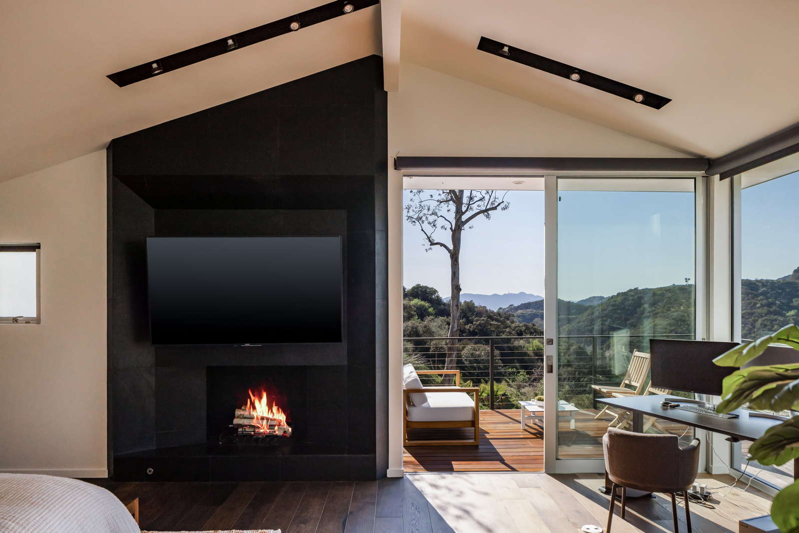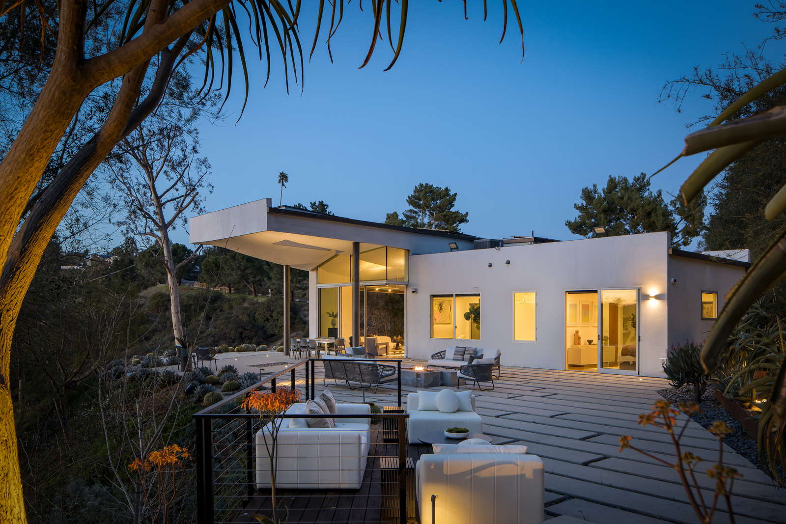 The primary suite is a tranquil retreat with a fireplace, spa-like ensuite, and a private terrace. Two additional en-suite bedrooms provide comfort and flexibility—one with direct patio access to multiple lounge areas and a fire pit for refined outdoor gatherings.