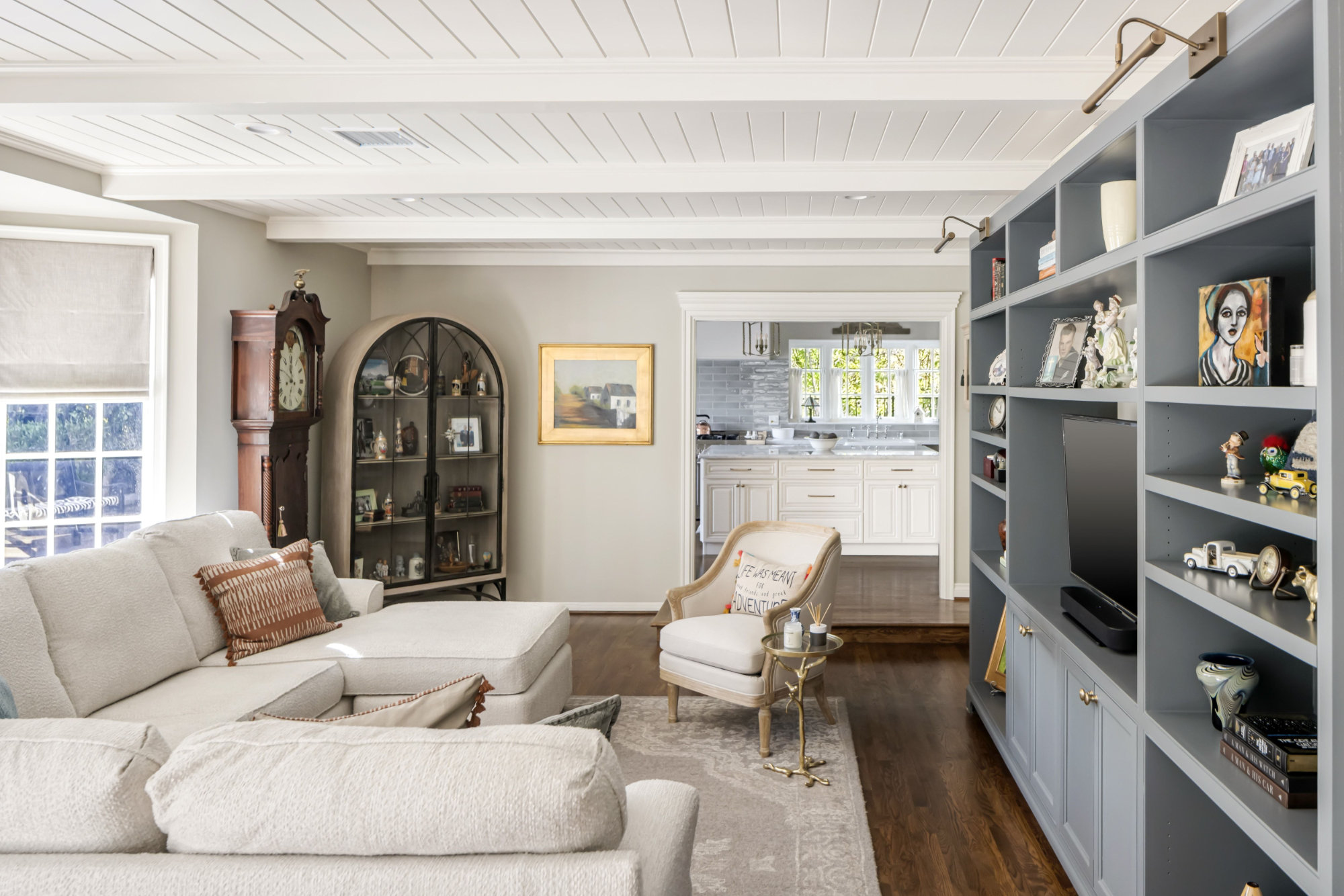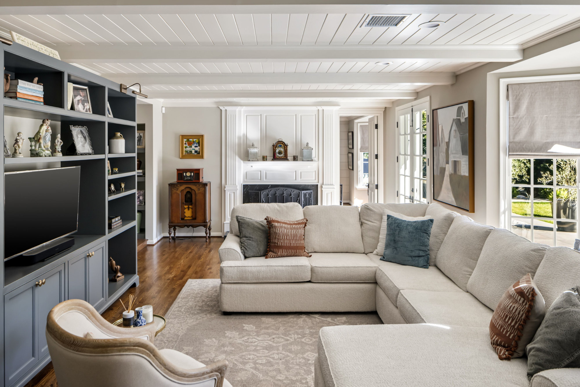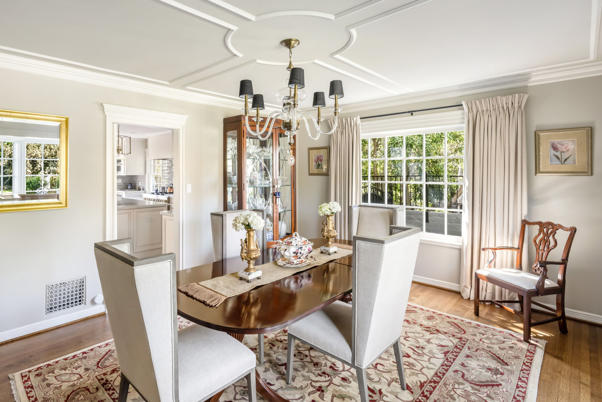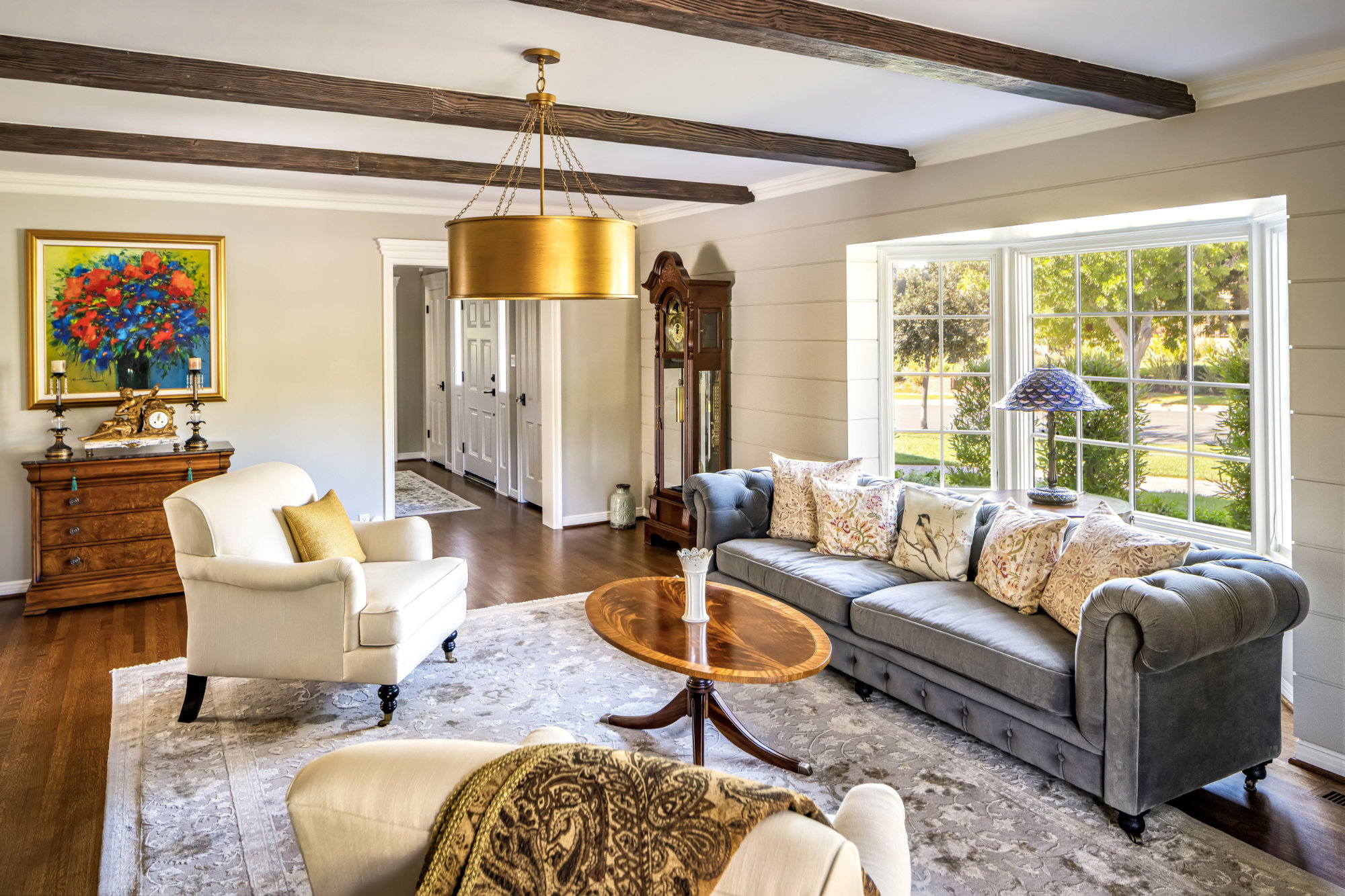 Step inside and be greeted by an expansive foyer leading to a professionally decorated living room, adorned with a wood-burning fireplace and beamed ceiling, and a gracious formal dining room featuring custom ceiling moldings and oversized bay windows, bathing the space in natural light.