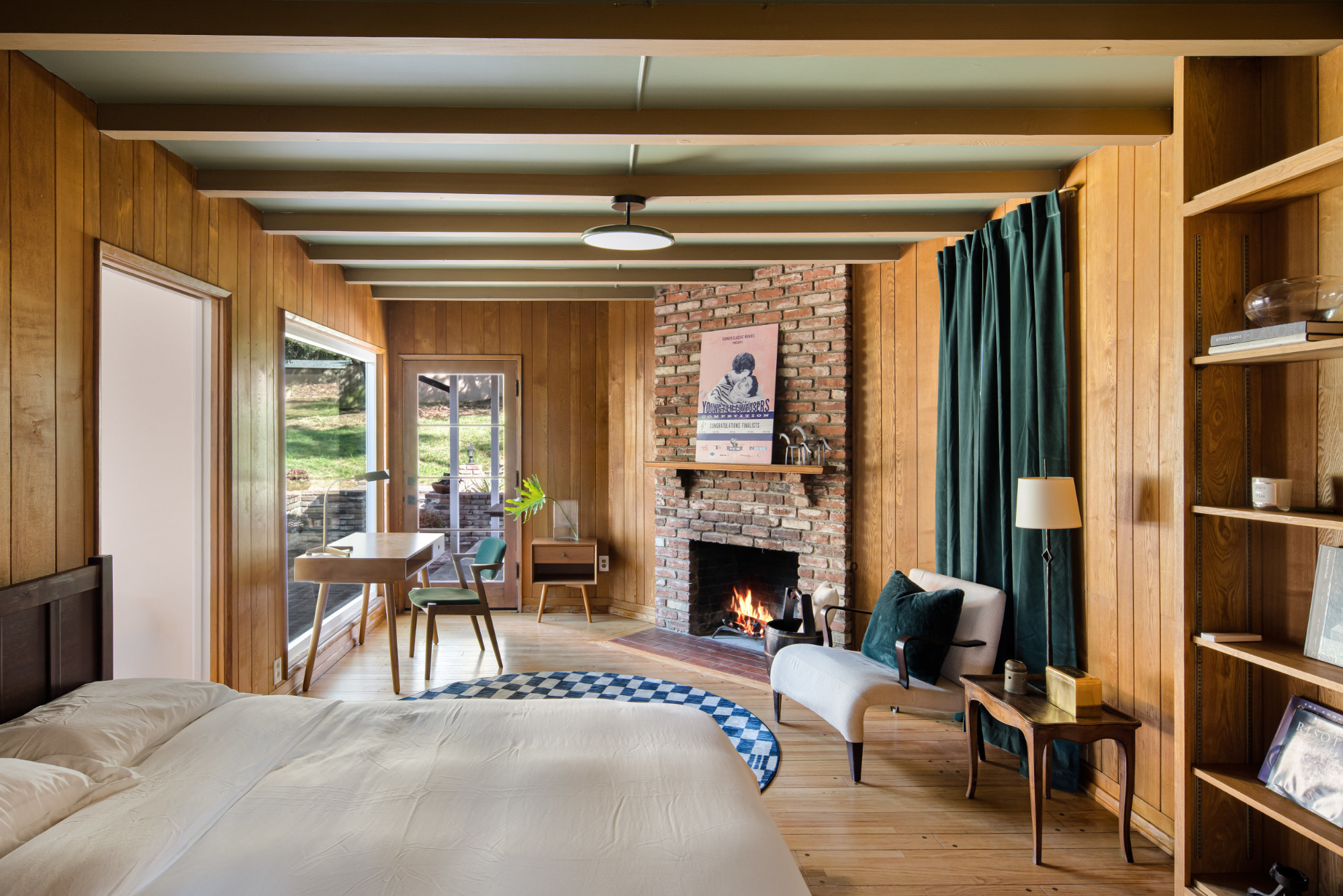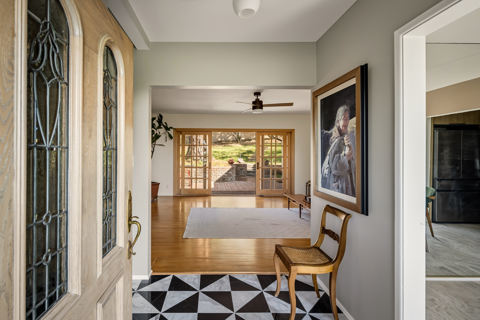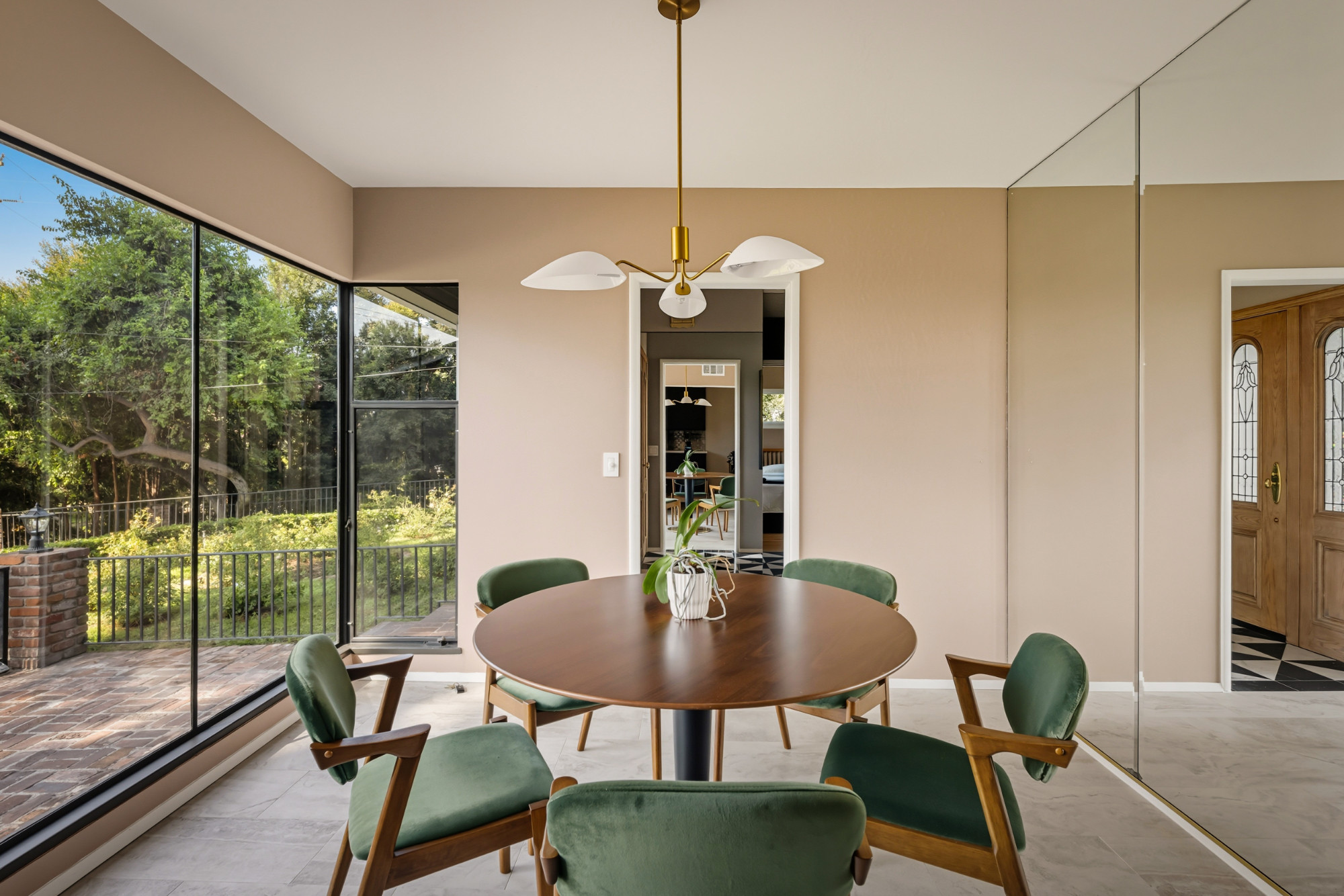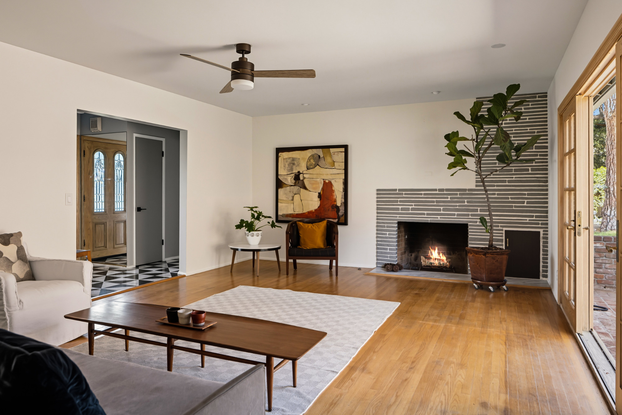 The home features 2 bedrooms and 2 baths with 1,375 square feet of living space on an expansive 23,236 square foot lot. The kitchen and bathrooms have been updated, while original charm remains throughout with hardwood floors (under carpet), open beam ceilings, crown molding, recessed lighting, French doors, built-in shelves, 2 fireplaces, and a separate dining room with a large picture window.