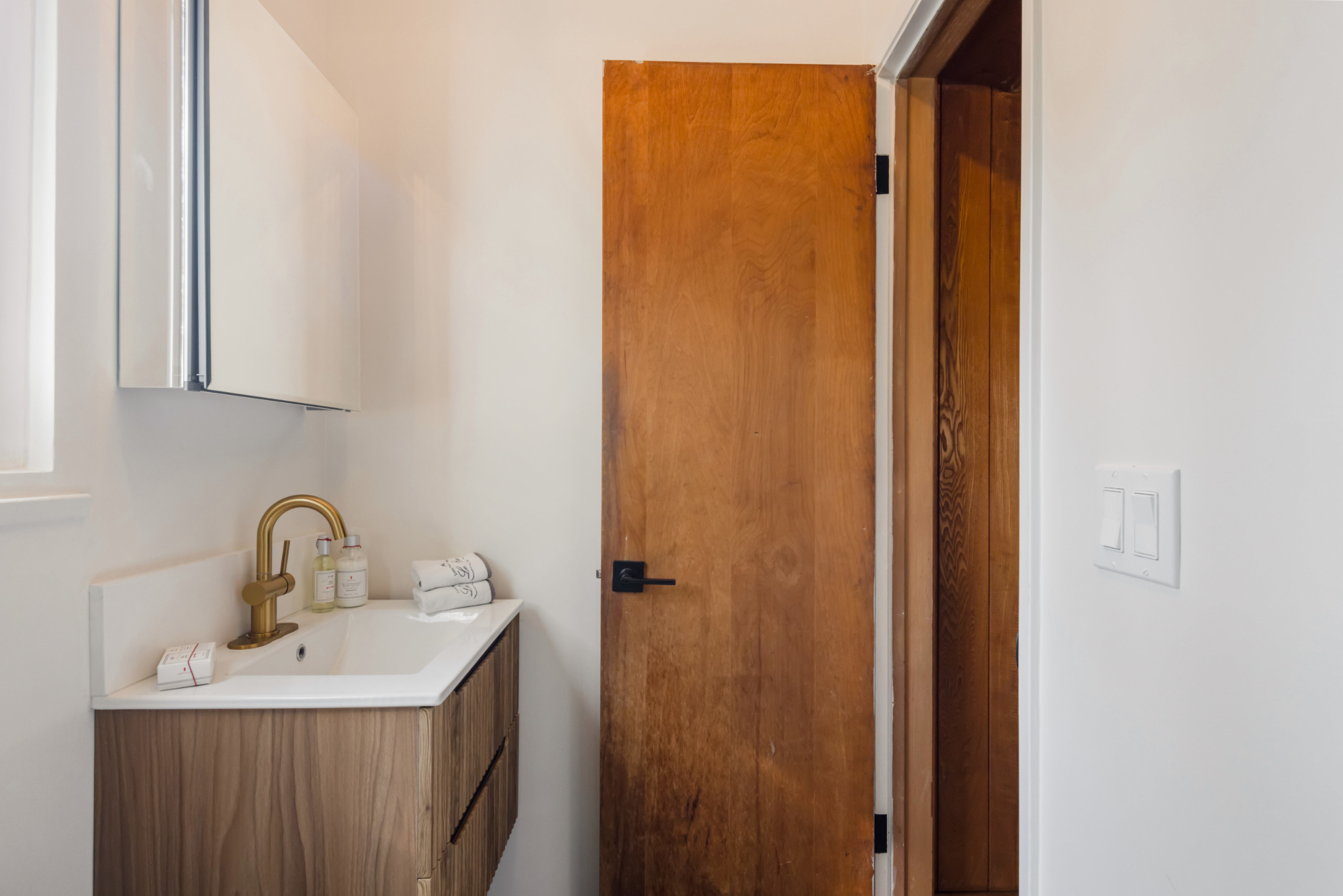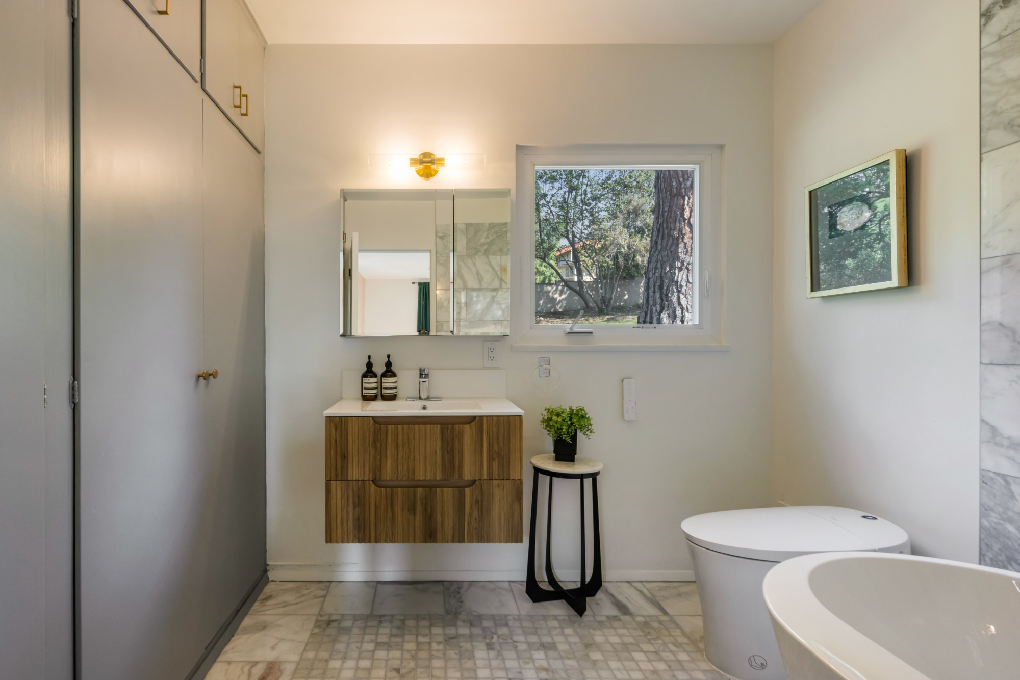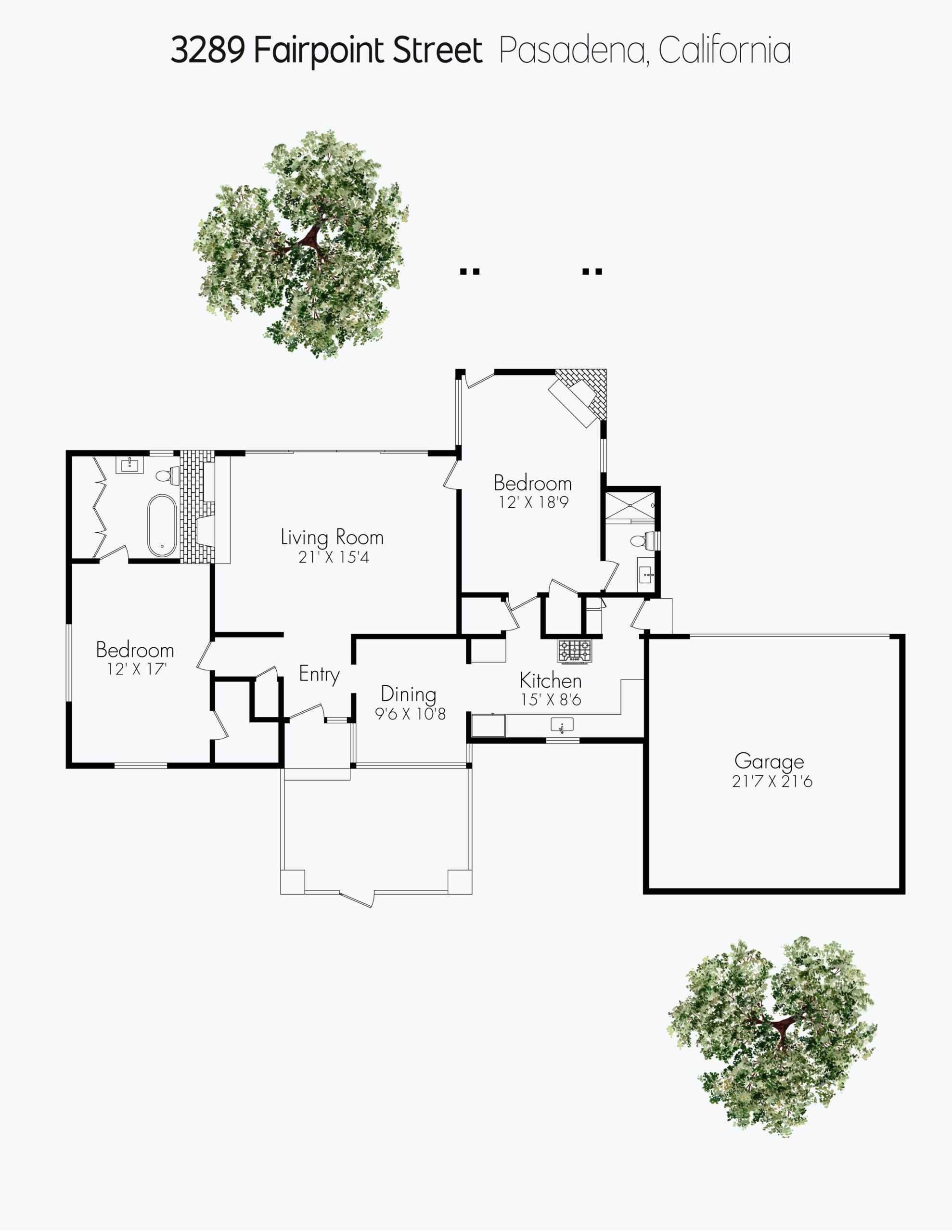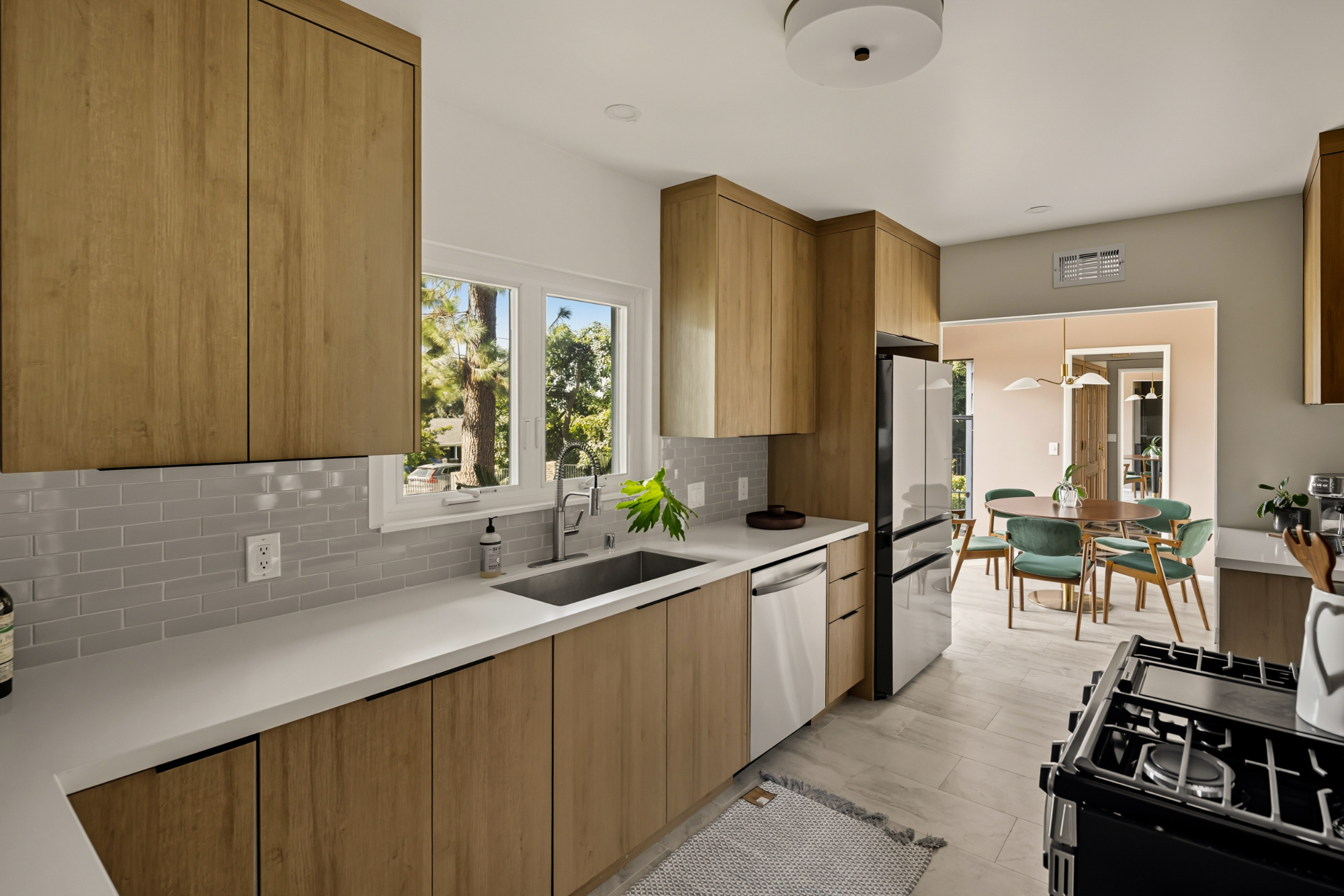 The home features 2 bedrooms and 2 baths with 1,375 square feet of living space on an expansive 23,236 square foot lot. The kitchen and bathrooms have been updated, while original charm remains throughout with hardwood floors (under carpet), open beam ceilings, crown molding, recessed lighting, French doors, built-in shelves, 2 fireplaces, and a separate dining room with a large picture window.