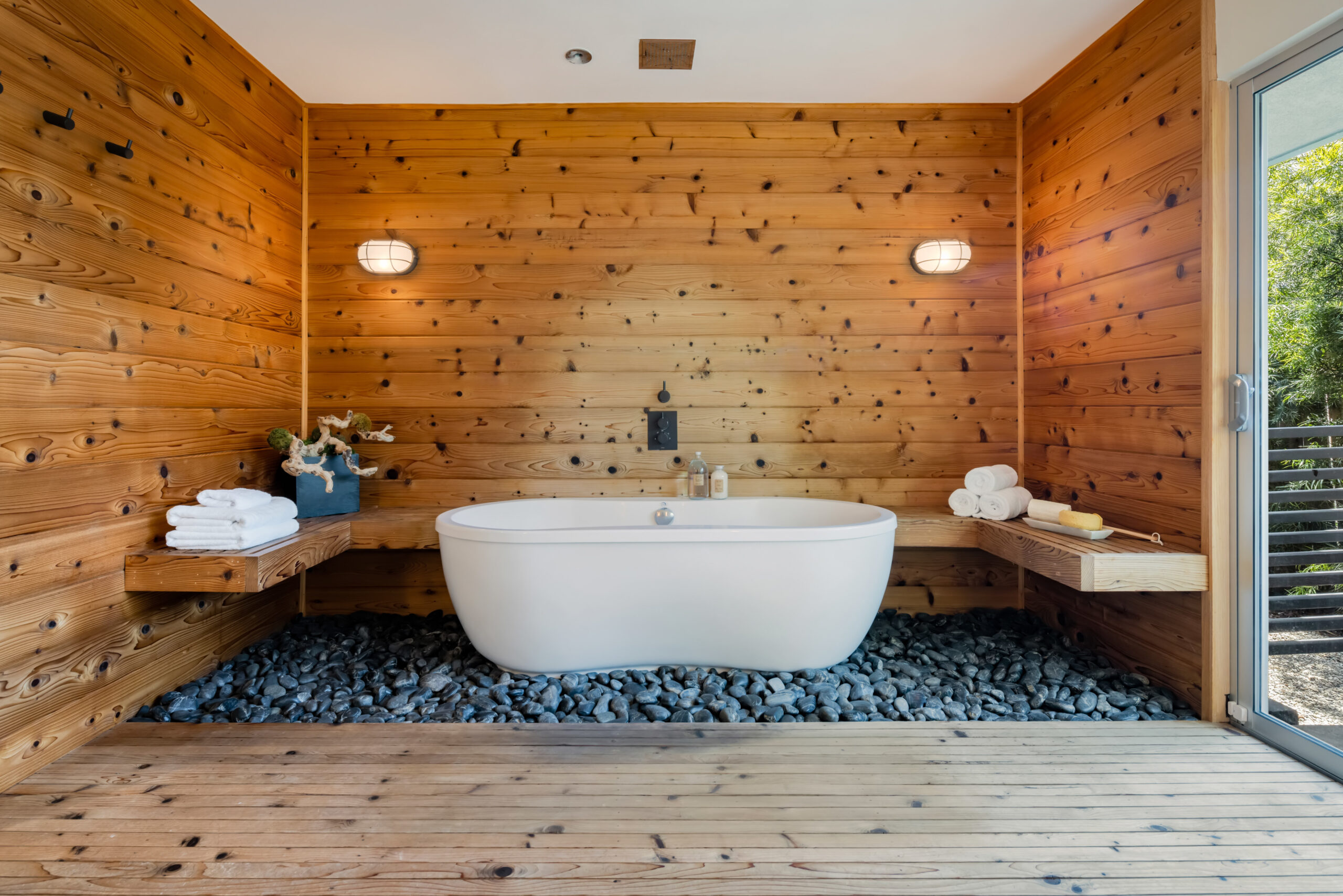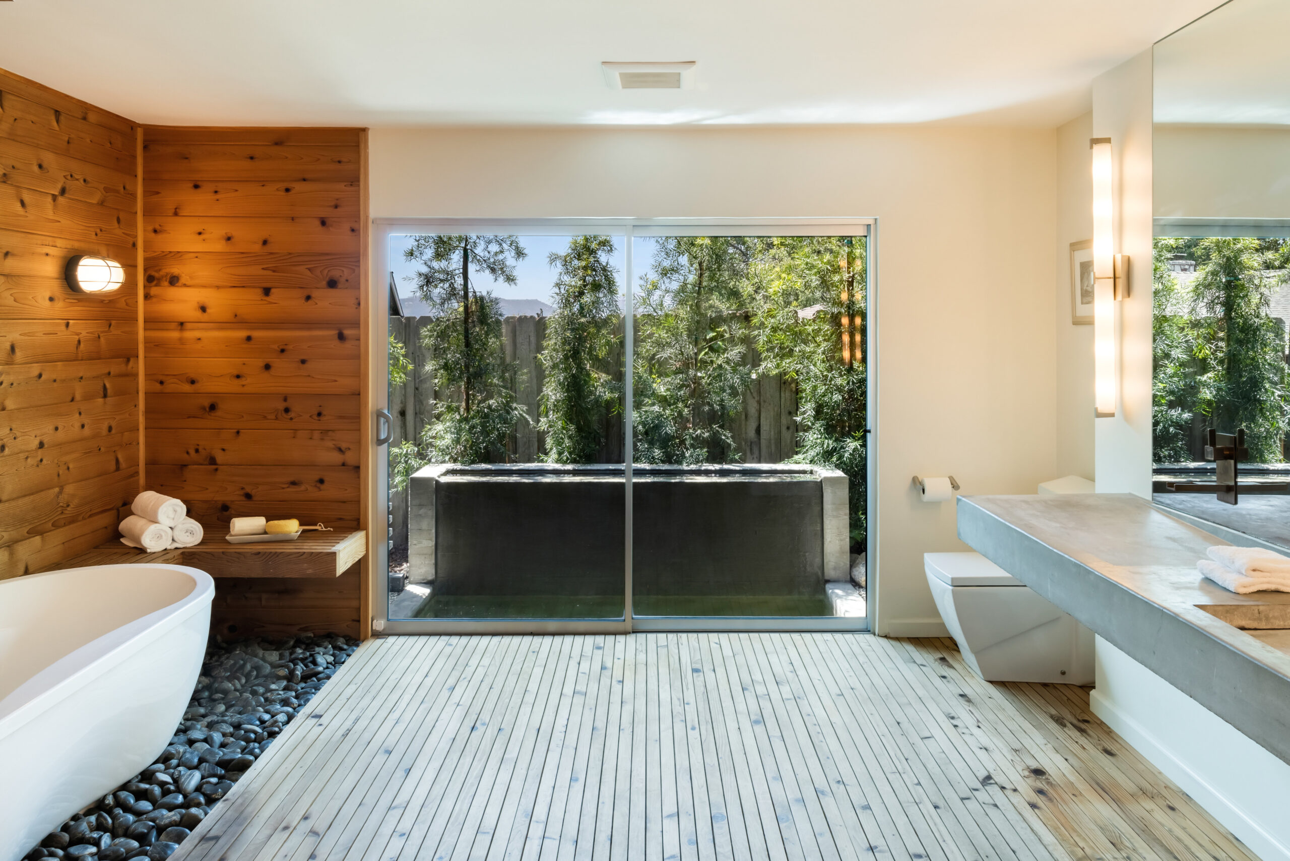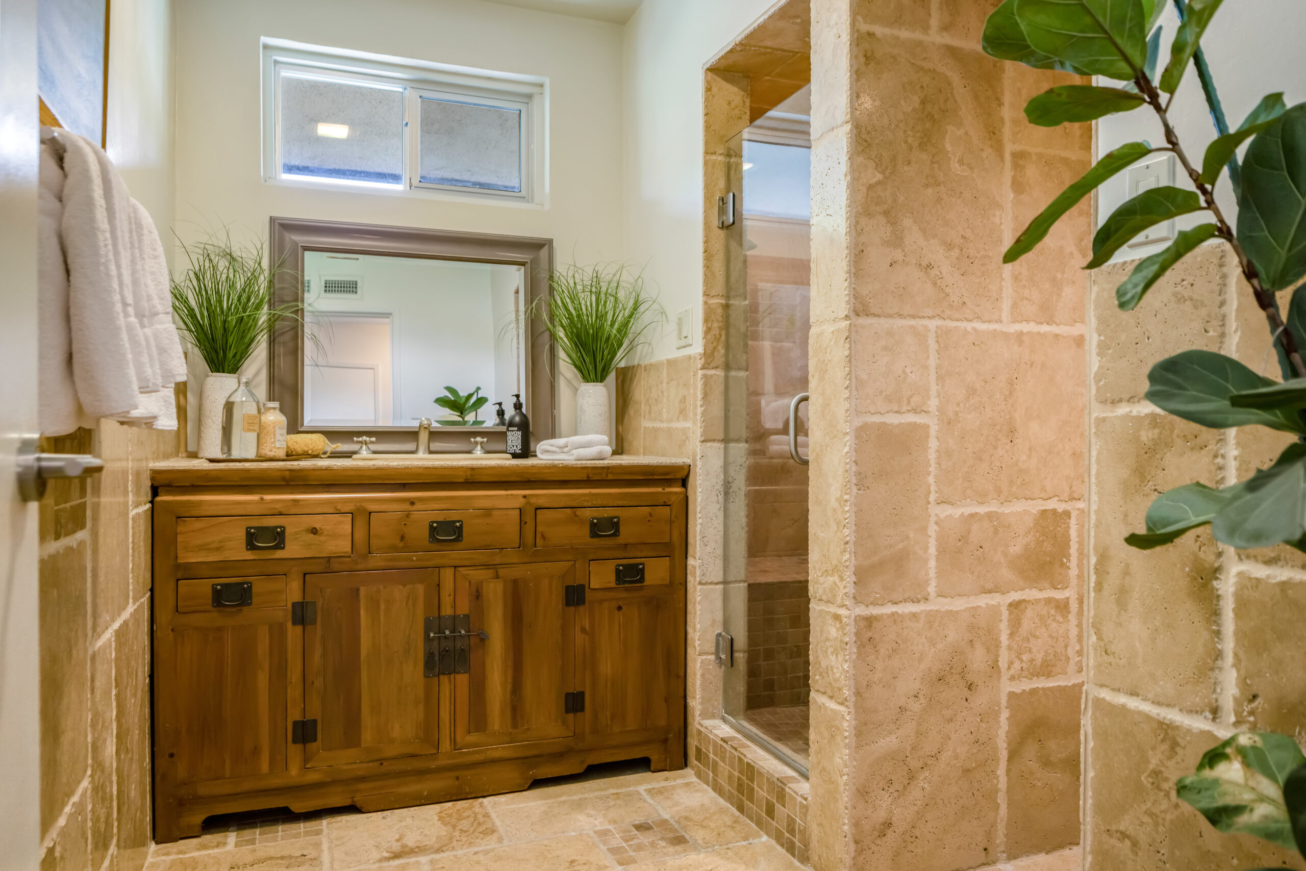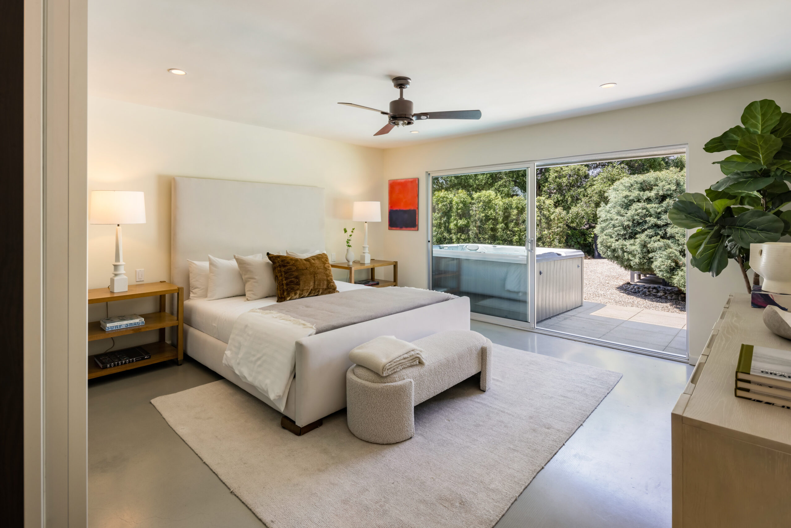 The primary bedroom retreat opens to a picturesque backyard oasis, complete with a hot tub, sizable pool, fire-pit, fruit trees and vegetable gardens. Step into the spa-like primary bathroom, reminiscent of a tropical getaway, featuring a rain shower, luxurious tub, and a soothing fountain that seamlessly blend indoor and outdoor.