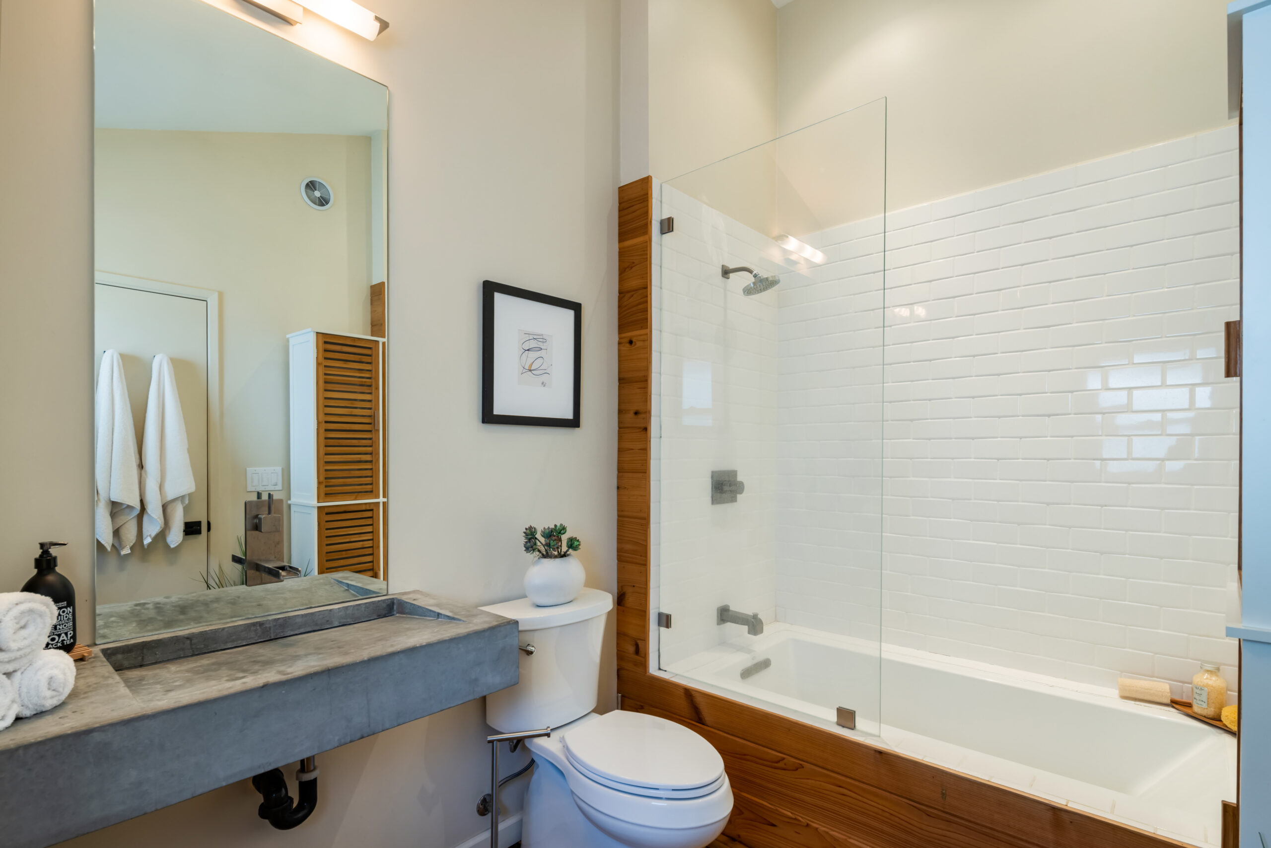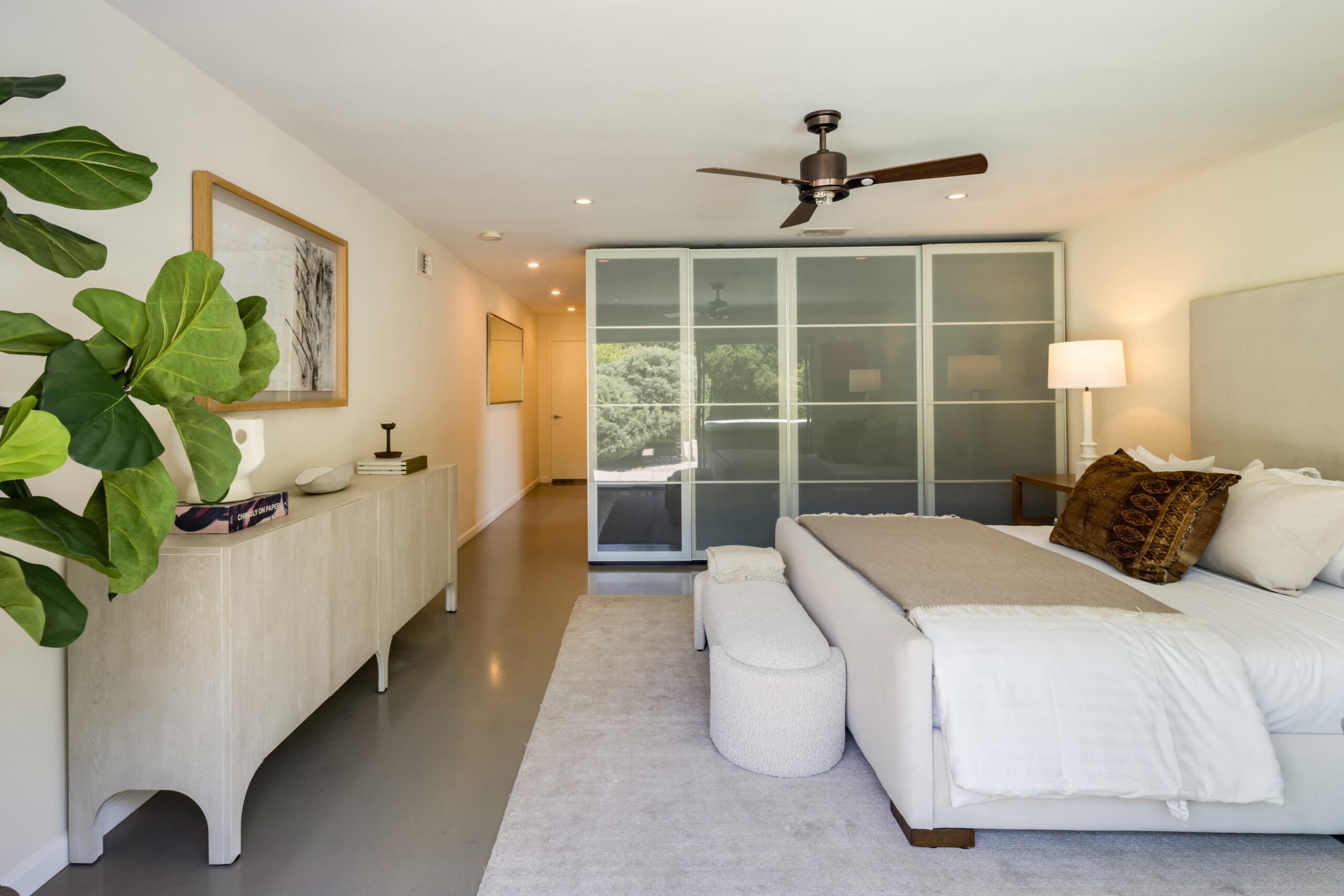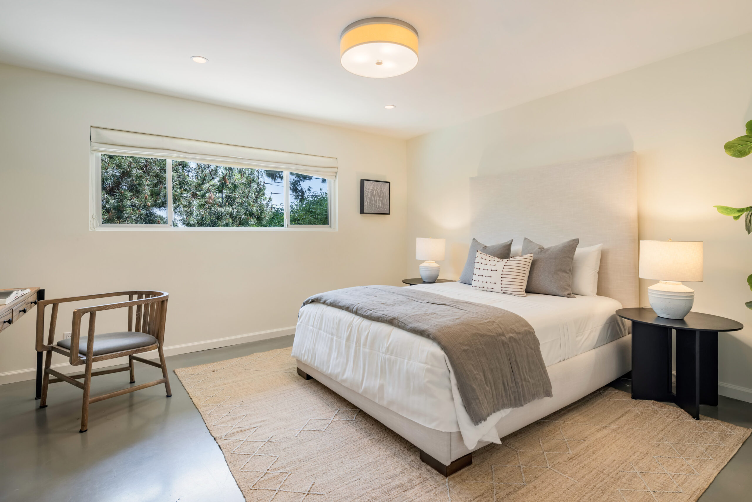 A large second bedroom features a walk-in closet and an ensuite bathroom. This room offers amazing views and direct access to the lush green backyard, making it an ideal space for relaxation. The third bedroom is generously sized, with a bathroom just outside the door and plenty of space for a desk, perfect for anyone working from home.