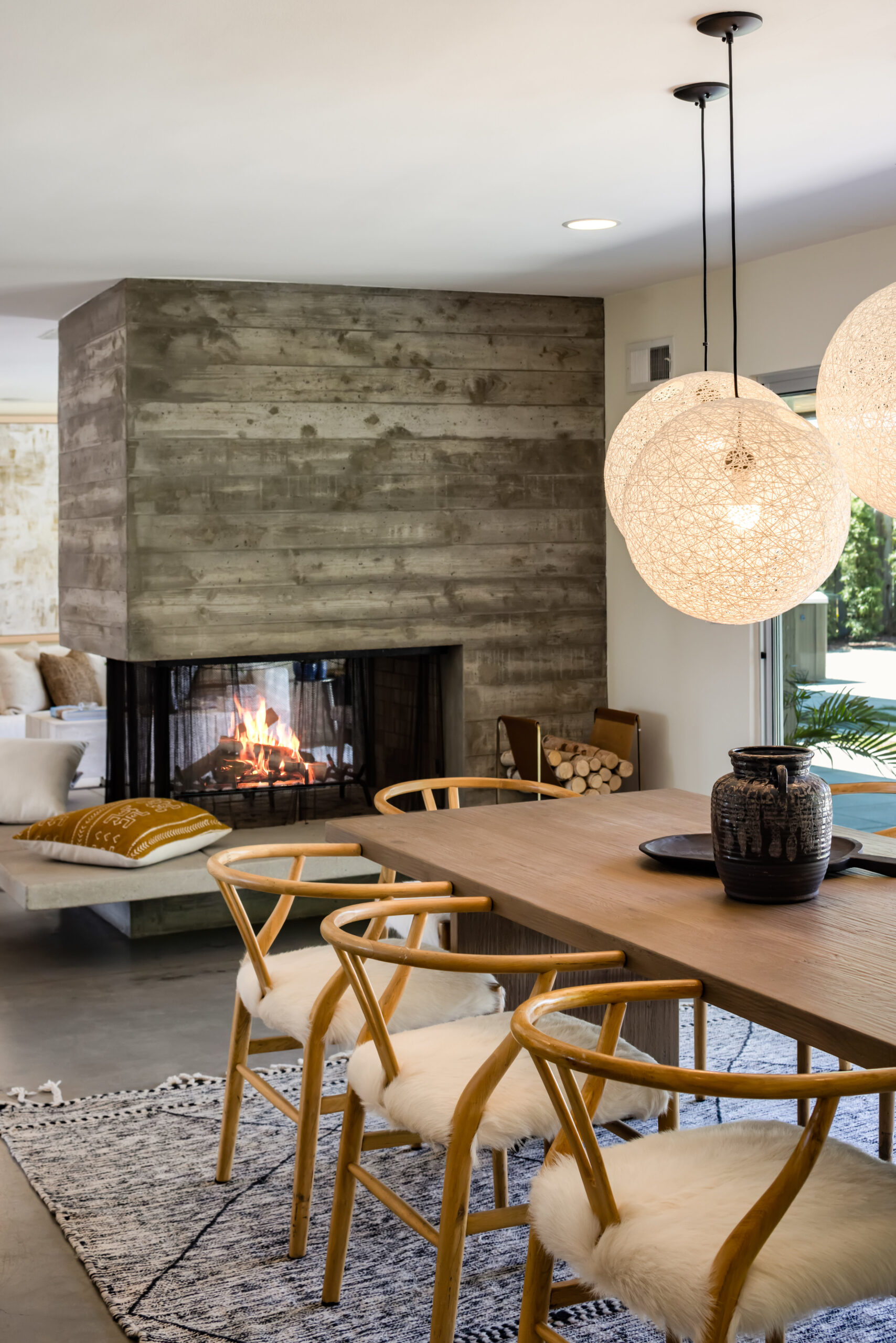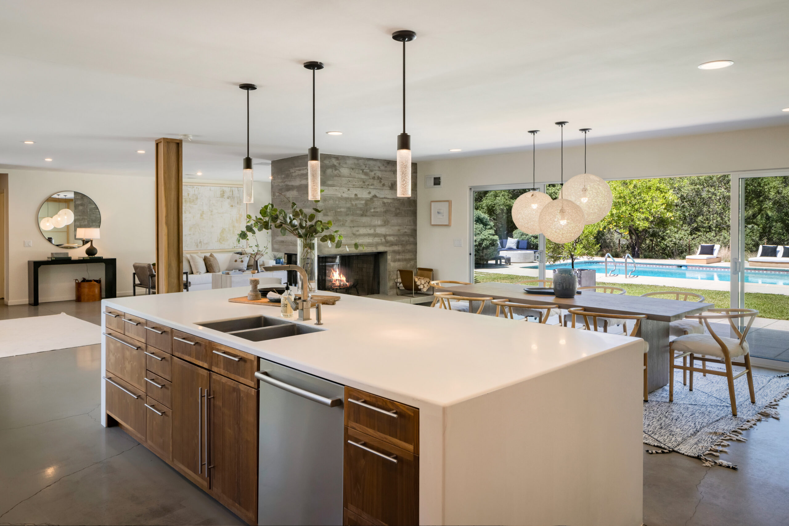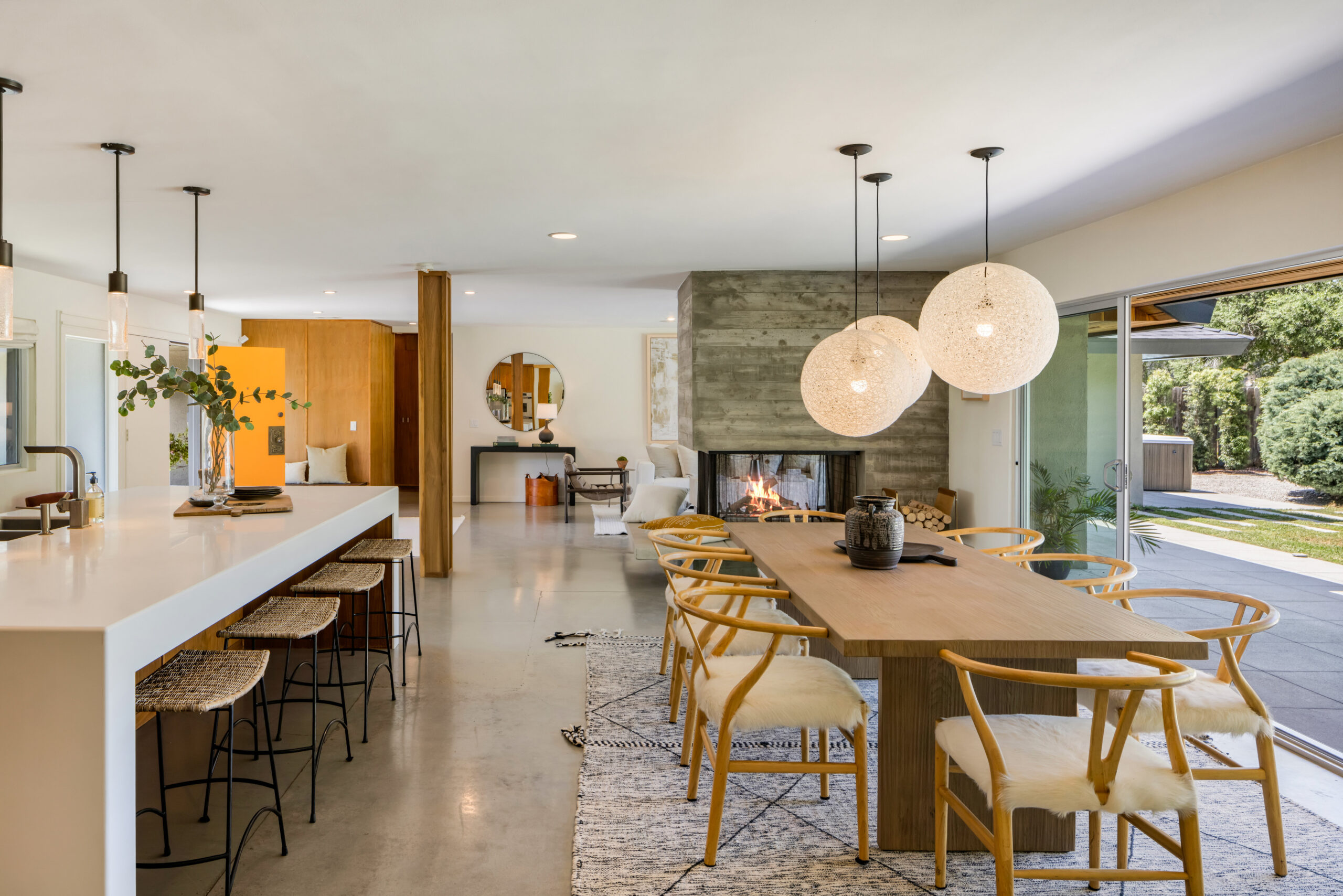 The heart of the home is a stunning open kitchen, seamlessly flowing into a dining room and family area divided by a contemporary peninsula fireplace. The expansive kitchen features a large island, ample counter space, and bar seating—an ideal setting for culinary enthusiasts and gatherings alike.