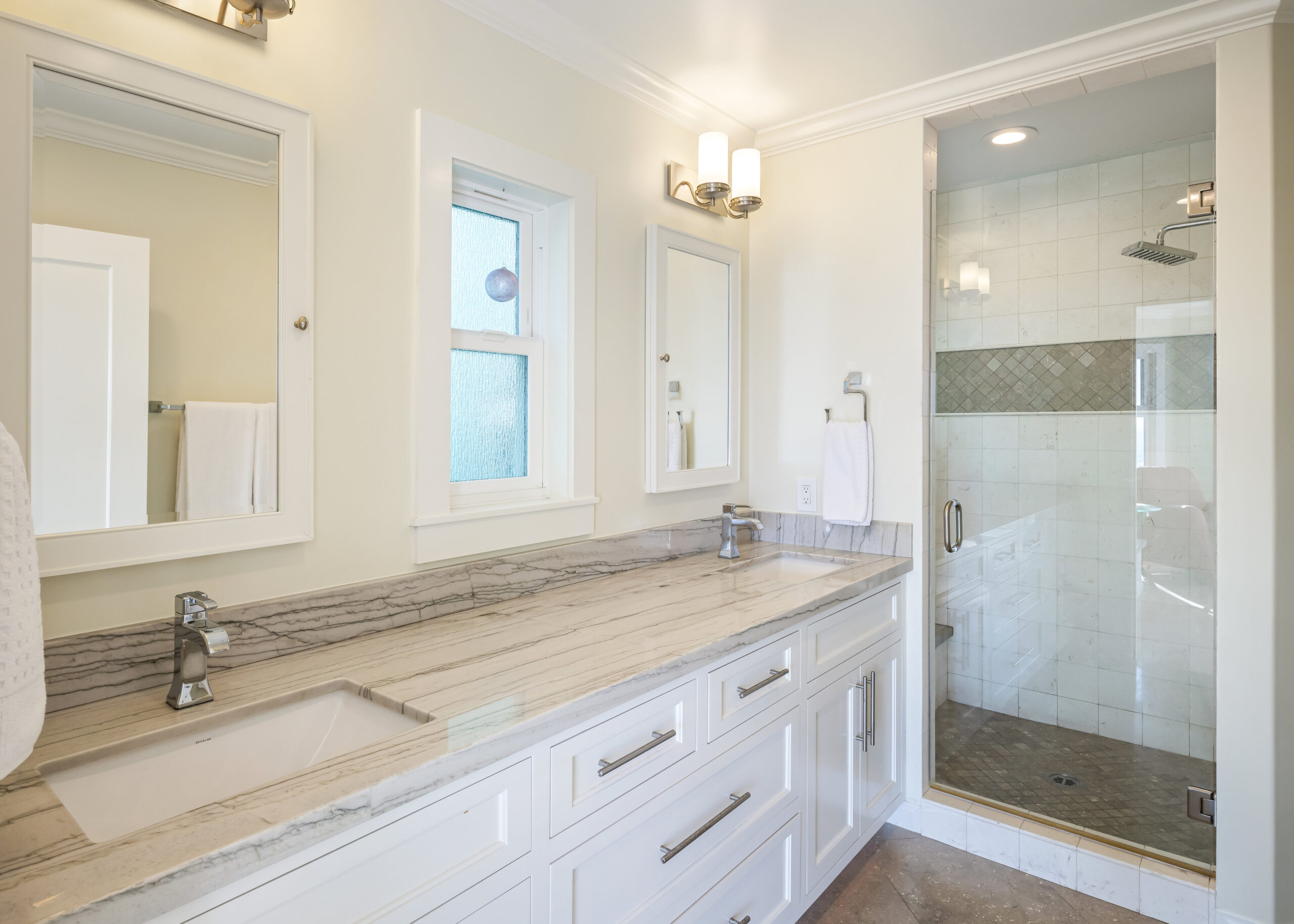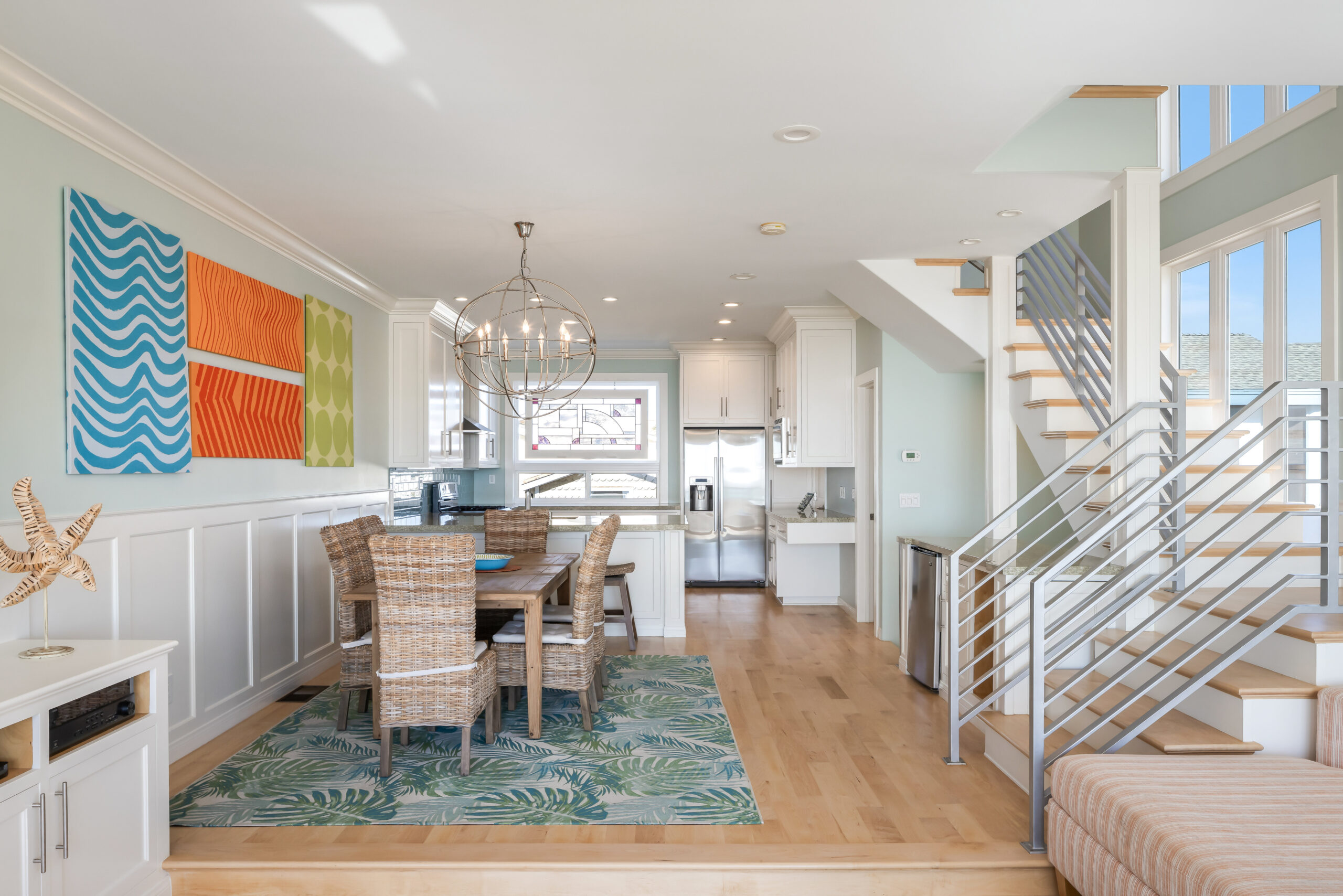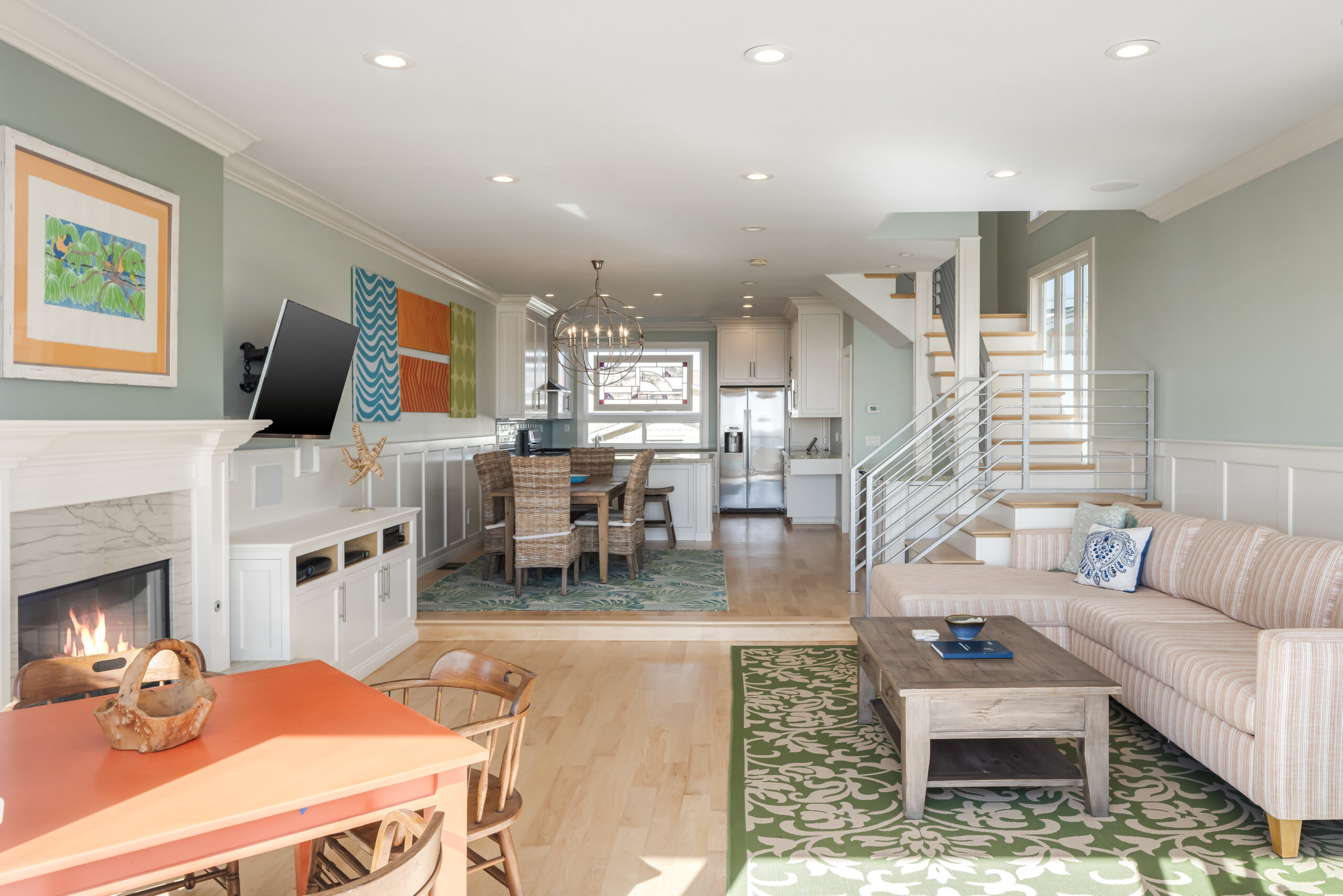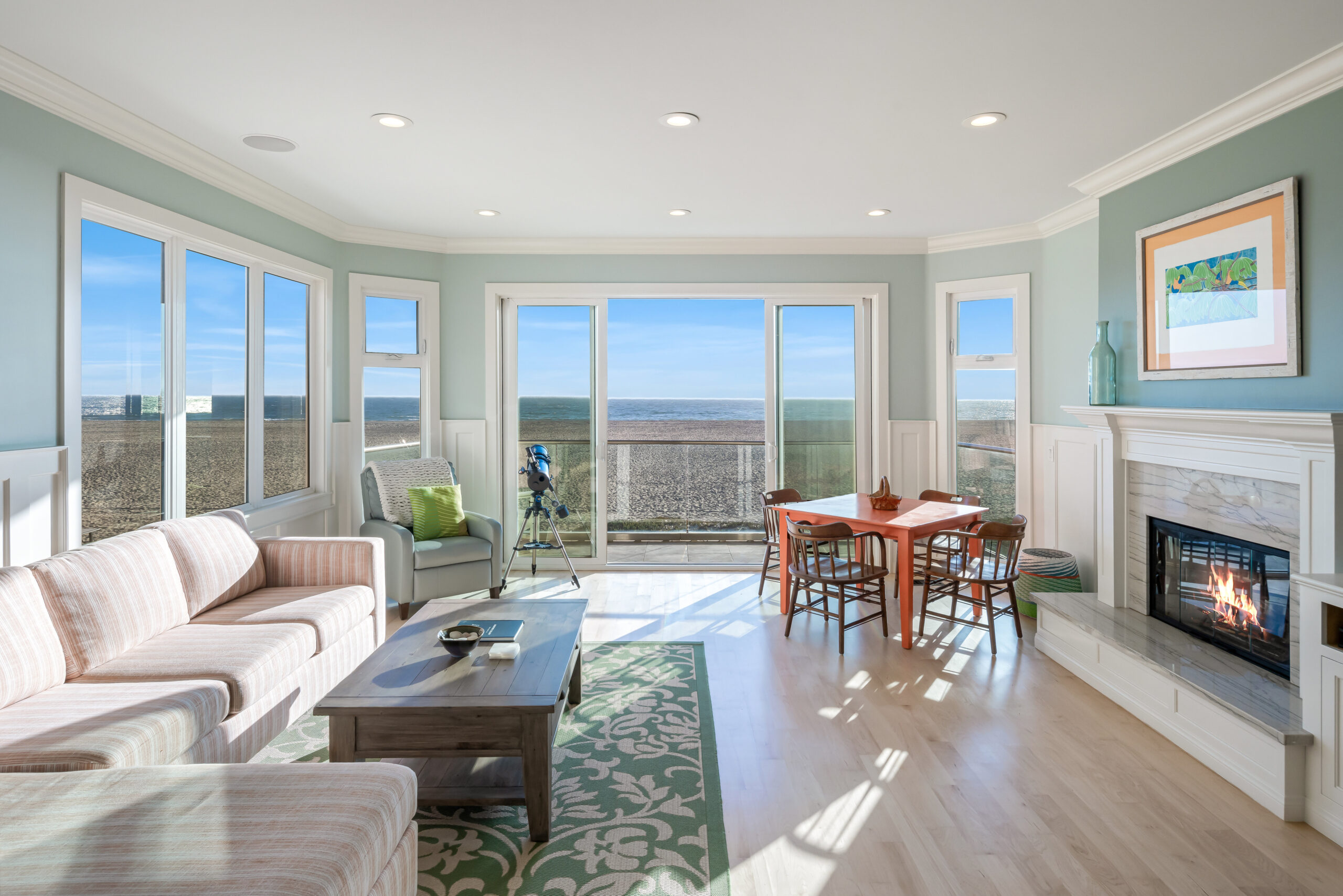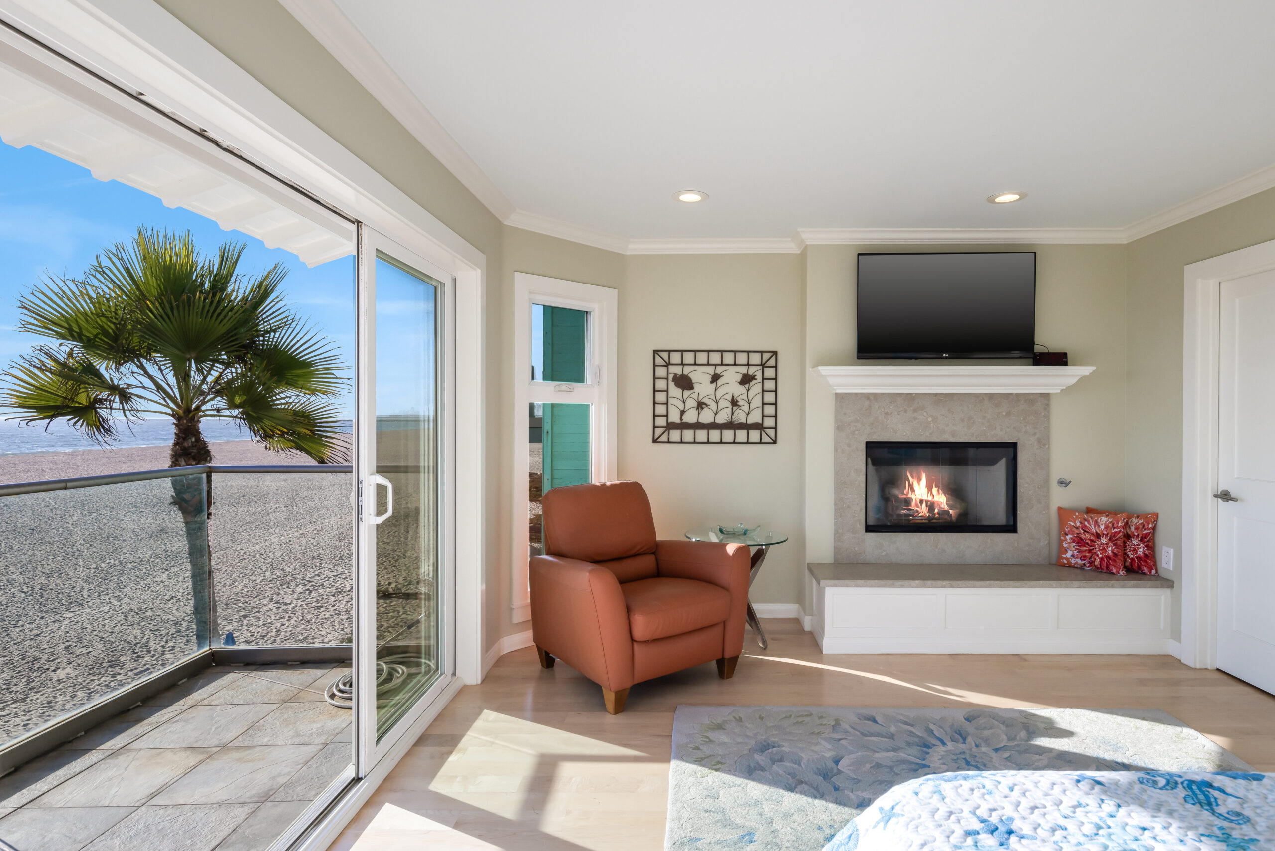 This home offers a versatile layout with one bedroom located on the first floor, currently set up as an additional family room, ideal for casual gatherings or as a flexible living space. The top floor houses three additional bedrooms, including the luxurious primary bedroom, which offers direct ocean views and its own cozy fireplace for a tranquil retreat.